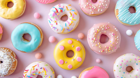 An assortment of colorful donuts with sprinkles arranged on a pastel background, creating a fun and appetizing display.