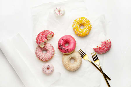 Delicious donuts. Pink and pastel colors decoration on white color background, copy space, closeup view