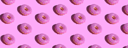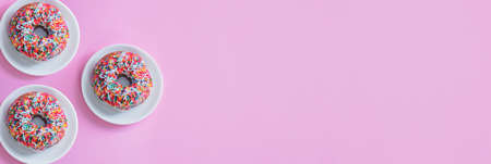 delicious donuts with multi-colored sprinkles on a pink background. banner