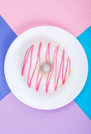 fresh white donut with chocolate chips on a pink paper wooden background top view