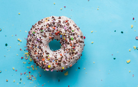 Donut with white frosting and colorful crumbs on a pastel blue background. Close up, with copy space