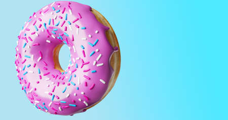 One donut with purple icing and sprinkles on blue background. Pastel colours. Bakery and food concept. 3d rendering illustration