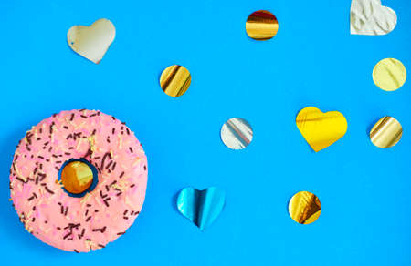 Colored donuts with colorful sprinkles on pink and blue background. National Pink Day or Doughnut day concept. Flat lay. Top view