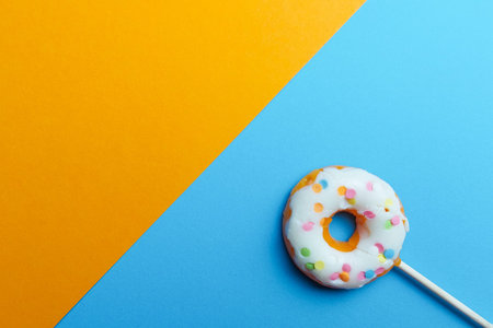 Lollipop in the shape of a donut on an orange-blue background. Top view layout. Space for the inscription. Holiday card.