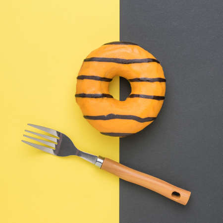 A fork and a glazed donut on a yellow and black background. A popular sweet snack.
