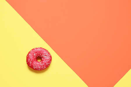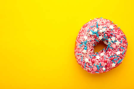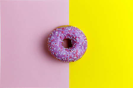 Donuts on a yellow background. Sweet donuts with different fillings. Sweet colorful tasty donuts with icing and sprinkles on pastel pink background.