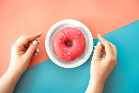 Appetizing donuts with icing on a colored background with female hands with a beautiful manicure. Trend photo