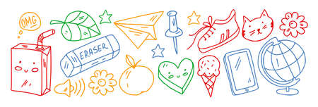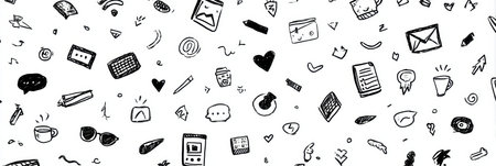 Hand-drawn doodles cover a white background featuring items like cups, pens, hearts, and electronic devices, capturing aspects of daily life and creativity.