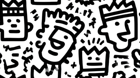 Black and white graphic pattern featuring a repeating motif of stylized faces and crowns. The design is simple, with bold line work and a whimsical, playful aesthetic. The pattern fills the entire image, creating a fun, decorative look.
