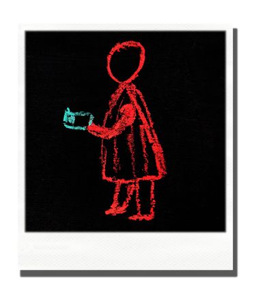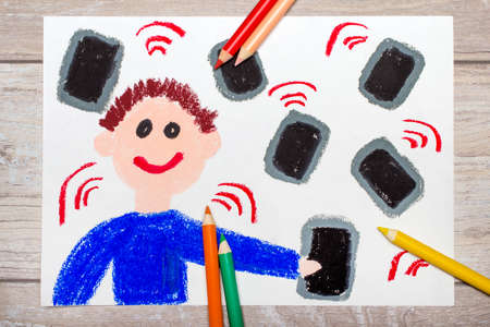 Photo of colorful drawing: A smiling boy surrounded by electronic devices, phones or tablets