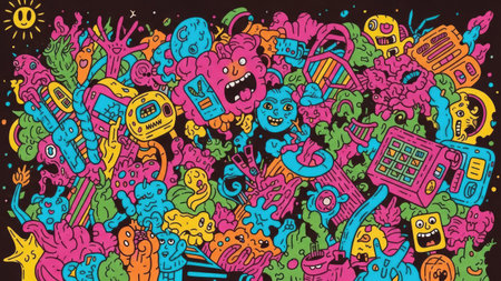 An eye-catching illustration showcases a dense composition of cartoon-style figures and objects. Vivid hues of pink, green, yellow, and blue create a visually stimulating pattern. The artwork employs an illustrative style, evoking a sense of fantasy. Suitable for diverse applications, including creative projects and editorial content, it could be used for a wide array of visual projects.