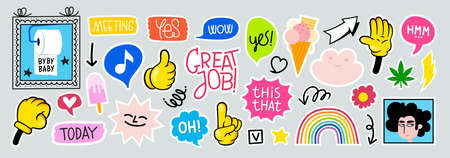 Set of Various Patches, pins, stamps or Stickers. Abstract funny cute comic Characters. Different Phrases and words. Hand drawn trendy Vector illustrations. Cartoon style. All elements are isolated