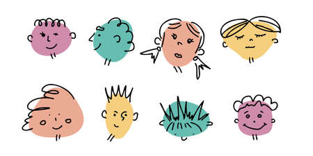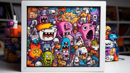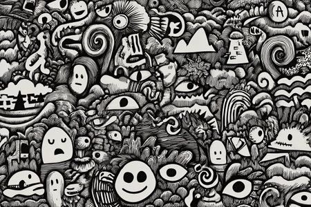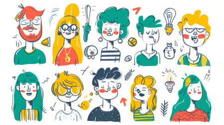 A vibrant collection of playful, abstract doodles featuring various characters and expressions on a white background