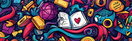 A colorful abstract image with a variety of shapes and patterns, including a book with a heart, a globe, and a yellow object with writing on it.