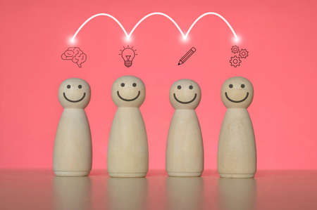 Wooden human figure is connected by lines with four peoples. Business management, sharing idea, leadership, teamwork, cooperation and collaboration concept.