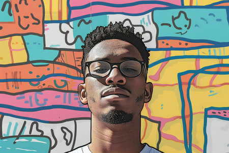 A bold and colorful illustration featuring a punk-style man with a mobile music recorder in vibrant candy tones.