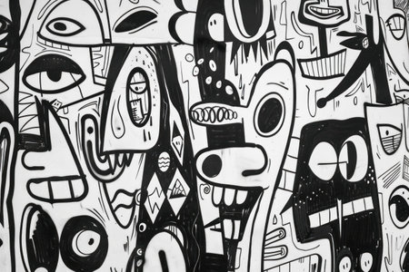 Abstract black and white mural featuring stylized faces and exaggerated features in a chaotic arrangement
