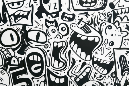 A vibrant collage of quirky cartoon faces featuring exaggerated expressions in black and white on a light background