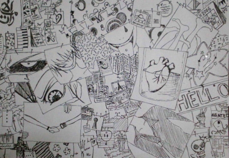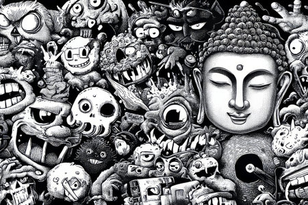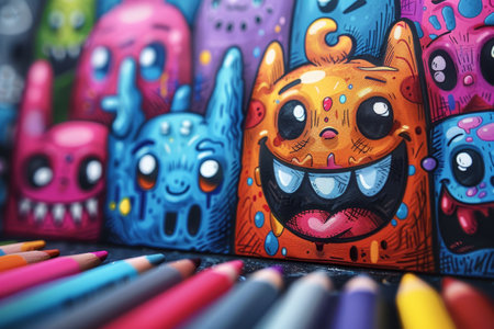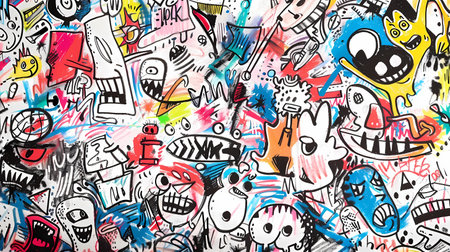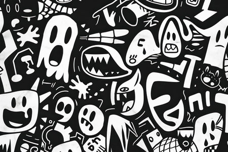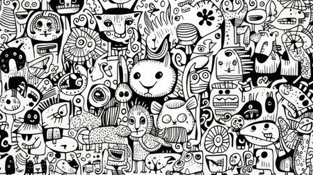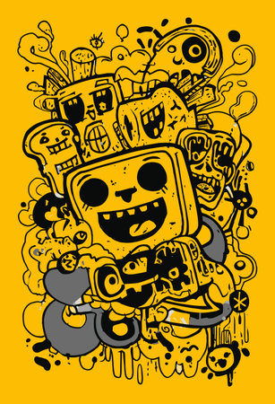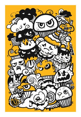 Vibrant doodle artwork featuring a mix of quirky characters and playful shapes against a lively yellow background. Perfect for fun designs and creative projects.