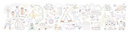 Kids drawings set. Childrens doodle pencil sketches. Childs line scribble art, hand-drawn Childish design elements. Flat vector illustration isolated on white background