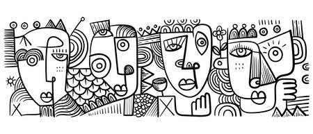 Abstract face portrait male and female figures geometric, shapes and doodle hand drawn vector illustration. Artistic design for wall art, decoration, poster, cover and print.