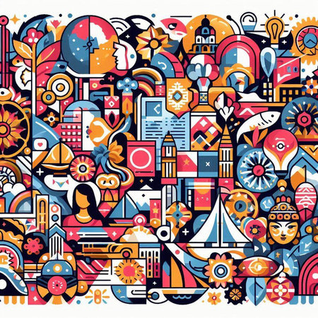 A colorful abstract image with a variety of shapes and patterns, including a book with a heart, a globe, and a yellow object with writing on it.