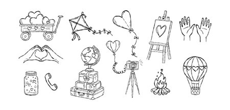 Heart wagon and travel suitcase valentine hand drawn doodle vector, globe and campfire sketch illustration, minimalist love elements for adventure story.