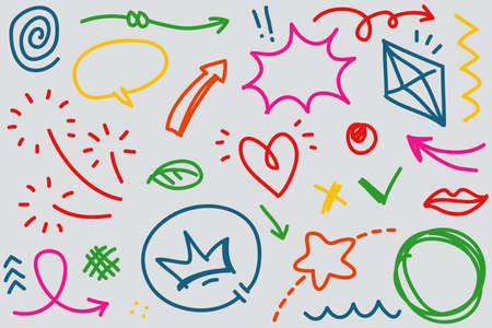 Abstract arrows, ribbons, crowns, hearts, explosions and other elements in hand drawn style for concept design. Colored doodle illustration. Vector template for decoration