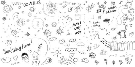 Vector hand drawn doodle set about coronavirus, Covid-19. Stay home, walk at home, take care. Pandemic protection.