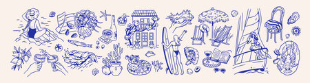 Dolce vita summer vacation set. Doodle style sketches, Mediterranean sea resort, beach, Italian food and wine, boat travel, lemon, cocktails. Holiday in Italy. Isolated hand-drawn vector illustrations