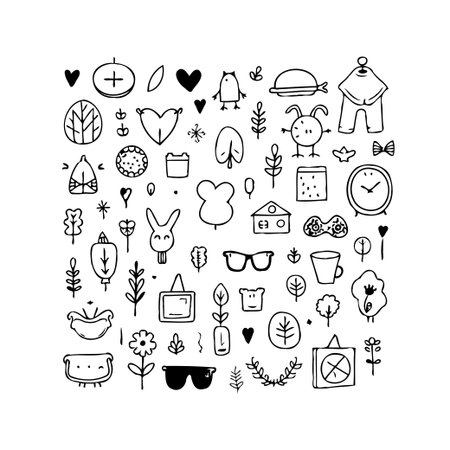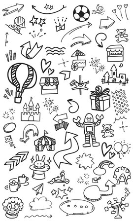 A delightful compilation of hand-drawn doodles creates a visually appealing and whimsical composition. This collection presents a fun and accessible style, suitable for a wide range of creative