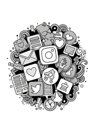 This artwork showcases a collection of quirky, hand-drawn doodles arranged in a charming composition. The black and white aesthetic enhances the simplicity, making it perfect for various creative