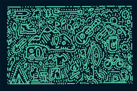 Summer camp background Doodle. The poster is a linear hand-drawn camping and travel poster. Icons background Recreation with various equipment, tent, axe, bike. Vector illustration