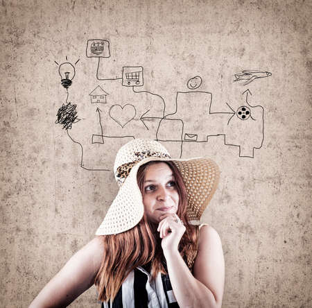 Thoughtful young girl with arrows leading to different icons