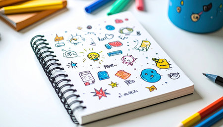 A vibrant notebook adorned with colorful illustrations and whimsical characters, lying on a wooden desk surrounded by colorful markers, showcasing creative potential.