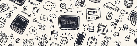 A collection of hand-drawn doodles featuring various technology items like computers, smartphones, and coding symbols, showing digital innovation.