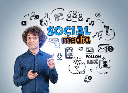 Businessman is standing near sketch with social media icons. Holding smartphone. Concept of inspiration and imagination