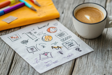 A creative workspace featuring hand-drawn sketches on paper, accompanied by a coffee cup and laptop. Ideal for conveying themes of brainstorming and productivity.