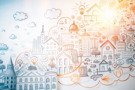 Hand-drawn city sketch, concept for urban development, future cityscape, sunlight