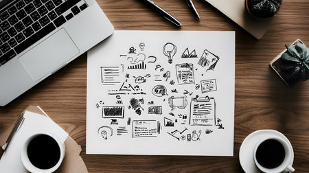 An overhead view of creative sketches on a notepad surrounded by coffee cups and a laptop, ideal for brainstorming themes.