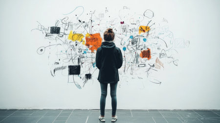 A woman sketches, surrounded by glowing neural patterns, symbolizing a creative mind engaging in therapeutic art for mental well-being. Neuro graphic draw.