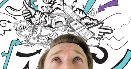 Digital composite of man looking at scattered arrow symbols over various objects. creativity, confusion and decisions.
