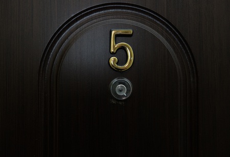 A stylish front door of a house cast in shadows on a teal wall, conveying a sense of welcome and security.