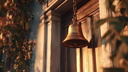 Old brass doorbell hanging on a rustic wooden door, bathed in warm golden light, symbolizing tradition, entrance, and homeliness in a classic setting with creeping vines