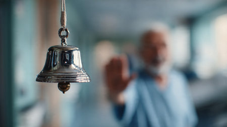 A silver bell hangs from a rope with a man in blue shirt out of focus