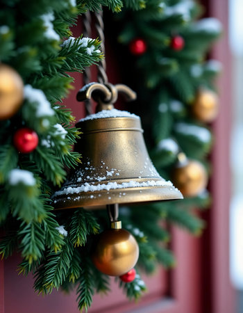 A beautifully crafted bell decoration hangs amidst a lush Christmas wreath adorning a front door. Soft snow covers the bell, adding a magical winter touch as the holidays approach.