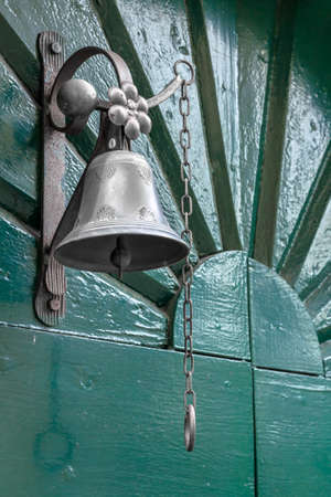 Old fashioned bell as doorbell on green wooden door.