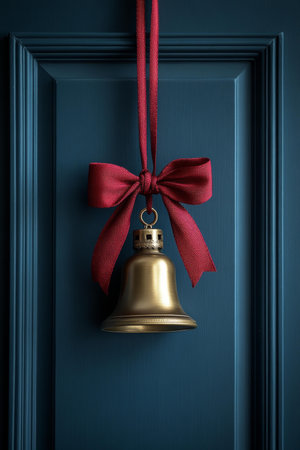 Festive bell with red bow hanging on door, holiday decoration.