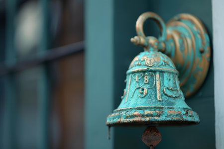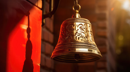 A close-up of a vintage brass bell hanging from a wooden frame, with intricate detailing and a rustic background, evoking a classic, nostalgic feel.