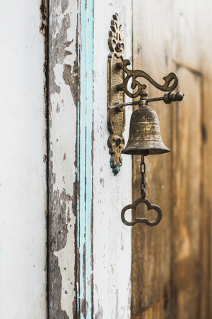Antique brass bell attached to entrance facade door wall
